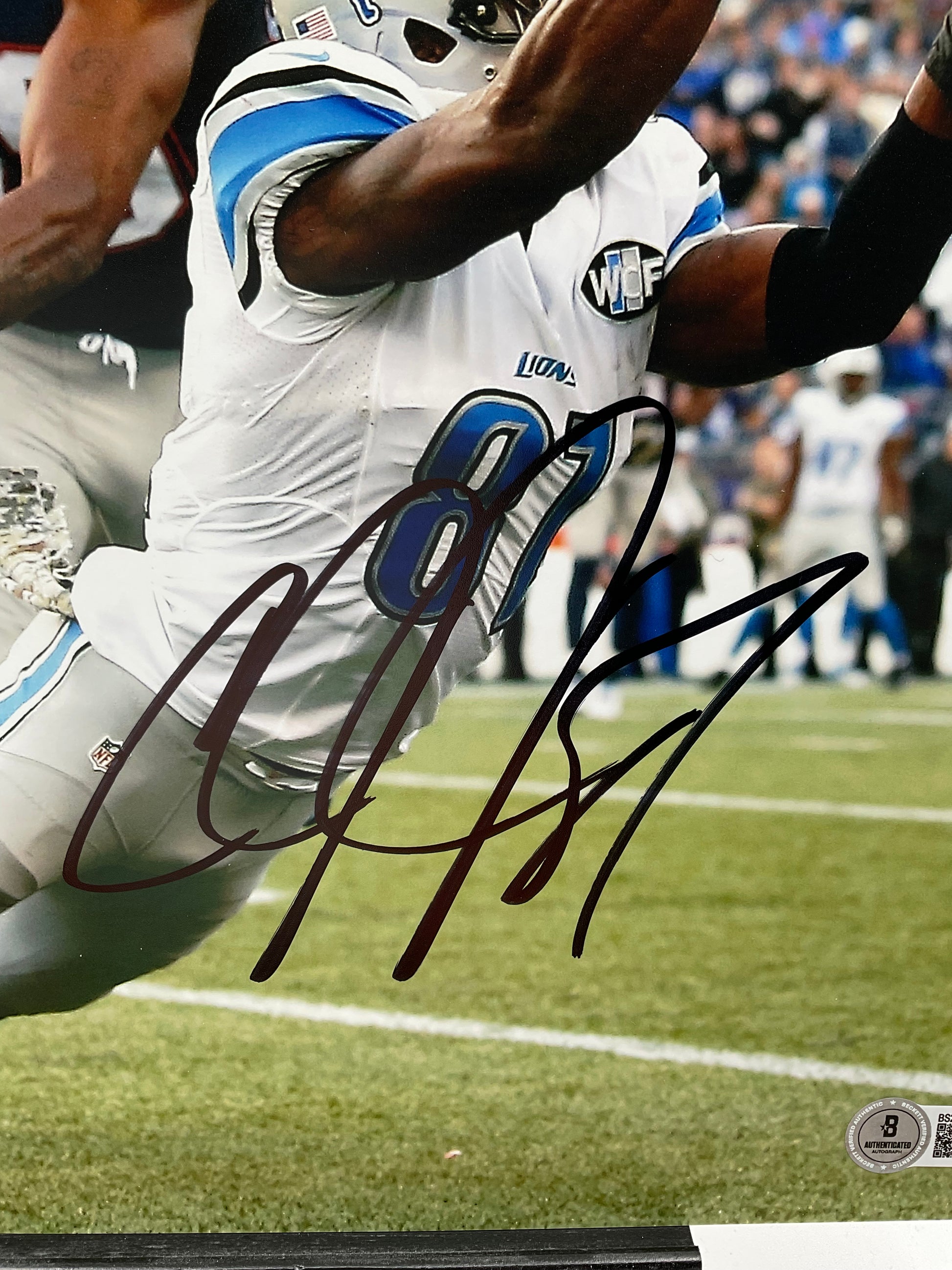 Calvin Johnson signed this photo. The autograph has a Certificate of Authenticity from Beckett Authentication Services (BAS) #BS29607